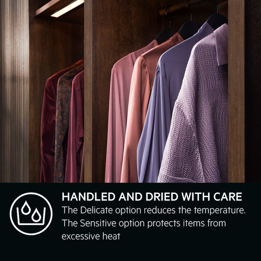 Sensor dryer: Sensor drying gives you exceptional drying results and total control. Simply choose the required level of dryness on the rotary control, from 'iron dry' for slightly damp clothes to 'extra dry' for ready-to-wear results. The machine will then sense when the clothes are dried to the level specified.