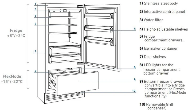 These built-in refrigerators are built to last forever, employing metal and glass inside and out for better temperature management. The lateral airflow system, with dual compressor and evaporator for refrigerator and freezer, reduces cold air loss when opening doors and allows for category-leading interior depth. The internal configuration is designed for maximum flexibility, with 425 L of refrigerator volume and 131 L of FlexMode volume. The FlexMode Refrigerator-Freezer allows to switch the bottom compartment between freezer and refrigerator with one touch. Interior LED lighting on top and sides provide bright interior illumination on all levels with minimal energy consumption. Integrated water filter connected to water line ensures regular production of ice cubes of customizable size.