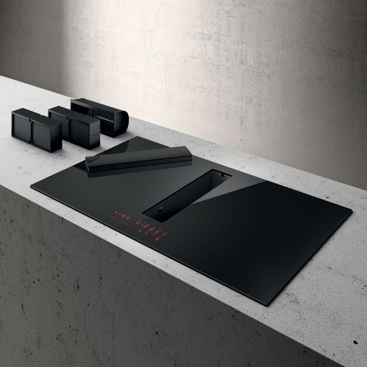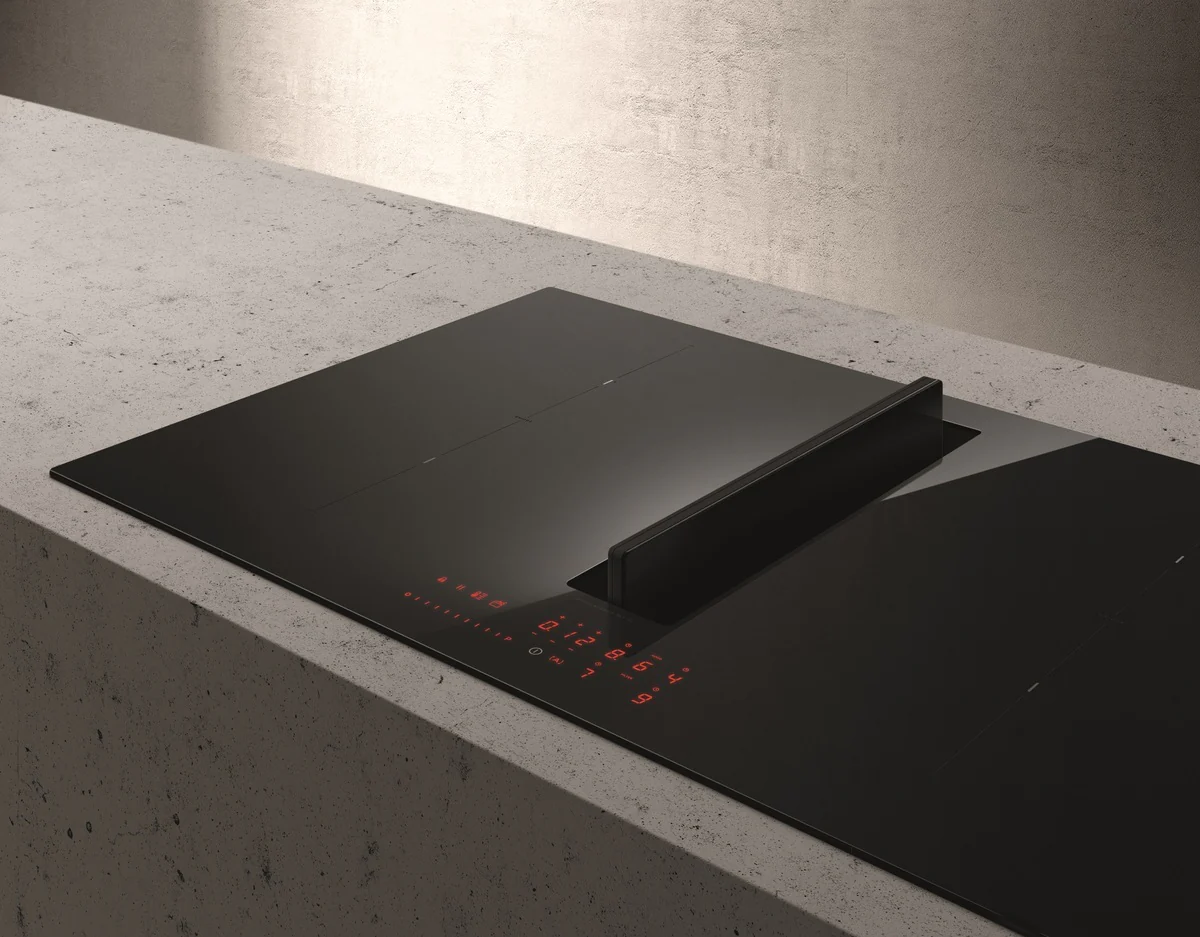 The black glass is the paradigm of this appliance, designed to fit seamlessly into any kitchen with unparalleled versatility. The extractor system is invisible, silent, and automatic. It powers on with a simple tap of the finger. The induction hob, featuring a double bridge zone to unlock a multitude of cooking possibilities, is easy to use and intuitive. With the extraction unit closed, the appliance presents clean, visually striking lines. The slider control makes it extremely easy to use the features on the hob; the highly efficient extraction system captures odours and vapours. The long-life filters are easy to remove and there is a special valve to drain accidental spills, ensuring total hygiene.