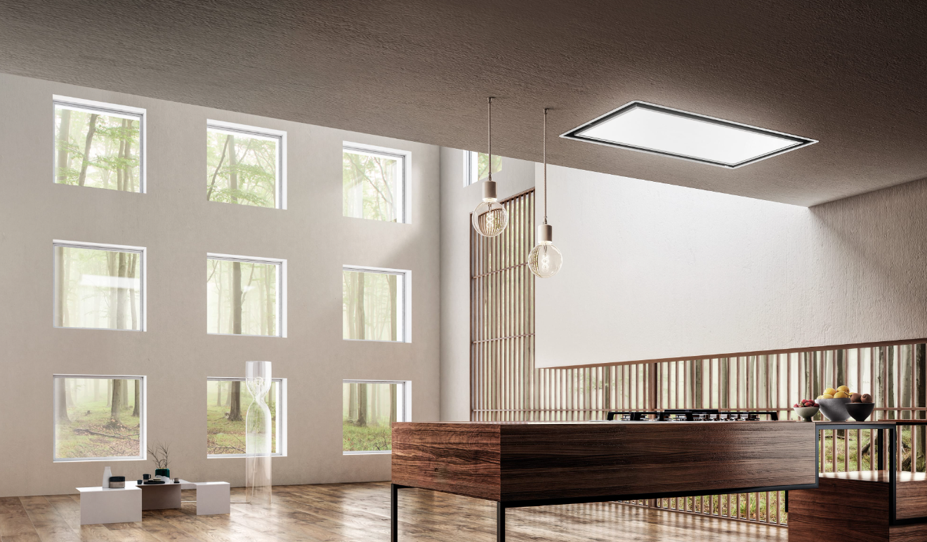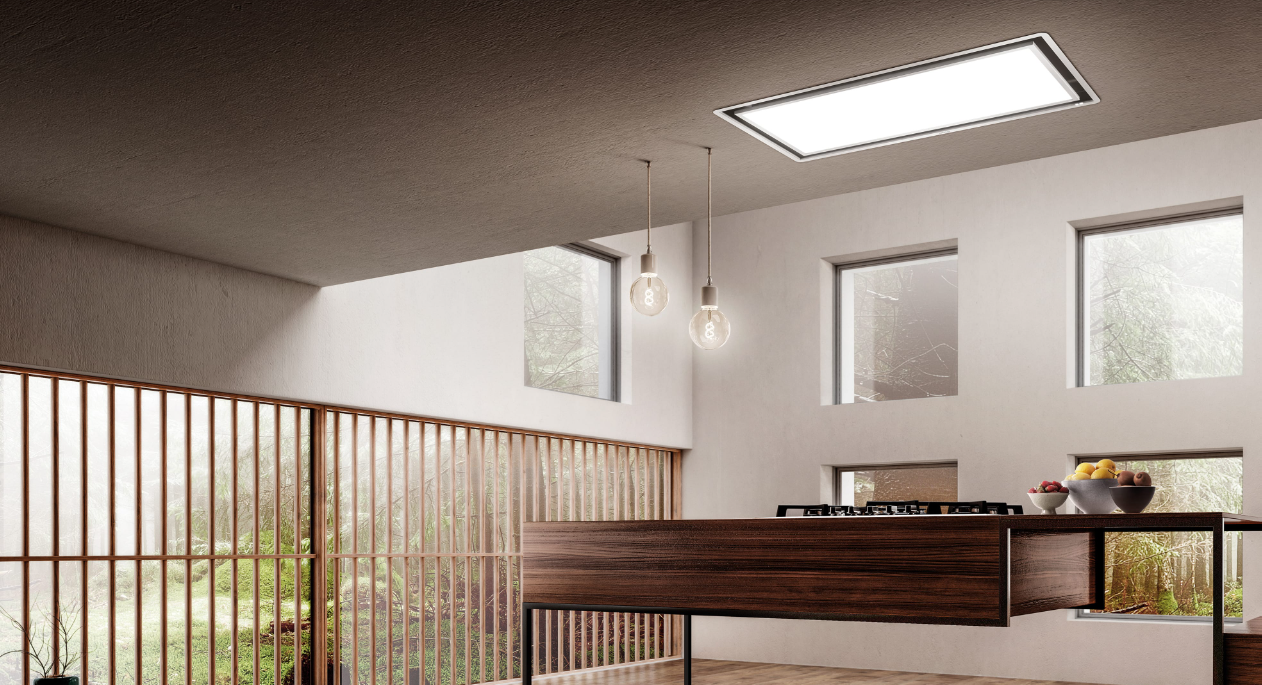 Skydome is an architectural lighting project, designed to enhance comfort in the kitchen, creating an unexpected atmosphere with an emotional impact that cleverly conceals the powerful and silent extraction system, guaranteeing maximum performance even at a significant distance from the cooktop. As a skylight, the 28-watt full LED panel guarantees uniform and well-calibrated light diffusion on the work surface and in the surrounding area, adjusting the brightness and temperature to achieve the perfect atmosphere at all times. Thanks to the Smart Remote control, Skydome can also act as the kitchen lighting hub, allowing you to manage additional lighting systems as well. Minimum space is required for installation thanks to the installation choices (5 directions) for the blower unit or wide range of external motors (4 versions). The super slim version is suitable for even the most demanding installations, with its signature compact size, up to 16 cm, without sacrificing high extraction power. The product can be converted into filter mode with an attractive accessory that guarantees excellent performance in terms of extraction and odour removal.