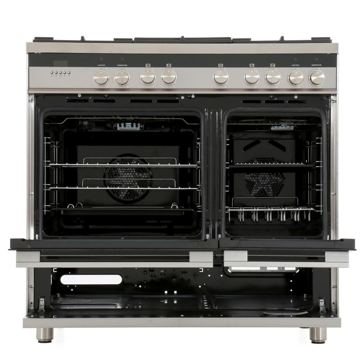 Designed for multi-shelf cooking, this freestanding dual fuel cooker provides 70L of total capacity in one cavitiy and 40L of total capacity in the other, giving you enough room for a large family roast and all the trimmings.