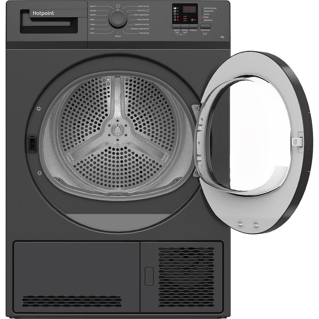 Hotpoint 8KG Condenser Dryer in Graphite, Energy Rating B. Features a digital time display and a single dial for easy selection of 15 drying cycles, including a quick 14-minute express cycle, refresh cycle and timed drying options. Comes with a transparent door for easy monitoring.