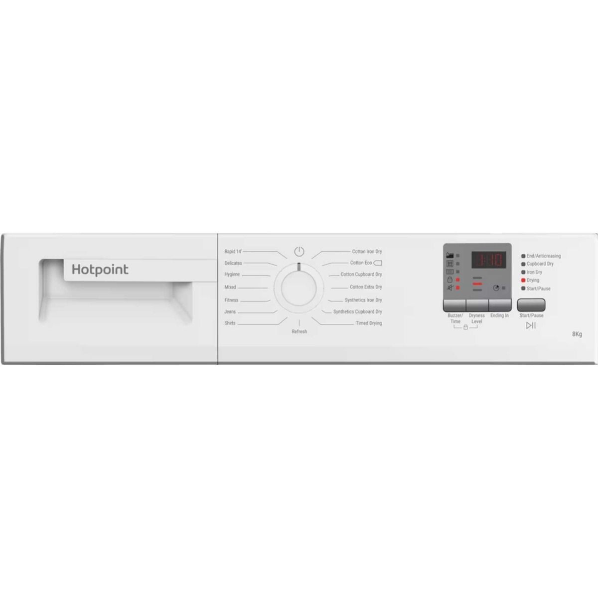 Hotpoint 8KG Condenser Dryer in White, Energy Rating B. Features a digital time display and a single dial for easy selection of 15 drying cycles, including a quick 14-minute express cycle, refresh cycle and timed drying options. Comes with a transparent door for easy monitoring.