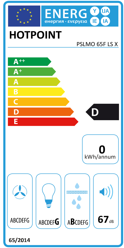 he Hotpoint PSLMO 65F LS K visor cooker hood is easy to use with a slider control offering 3 speeds to suit the level of vapours, with a maximum extraction rate of 272 m³/hr. Available in Black, white or stainless steel, this model comes complete with a grease filter and charcoal filter and the light makes sure you can always see what's cooking.Key Features3 SpeedsSlider controlsHalogen lightDEDD efficiency ratings52-71 dB(A) Noise level