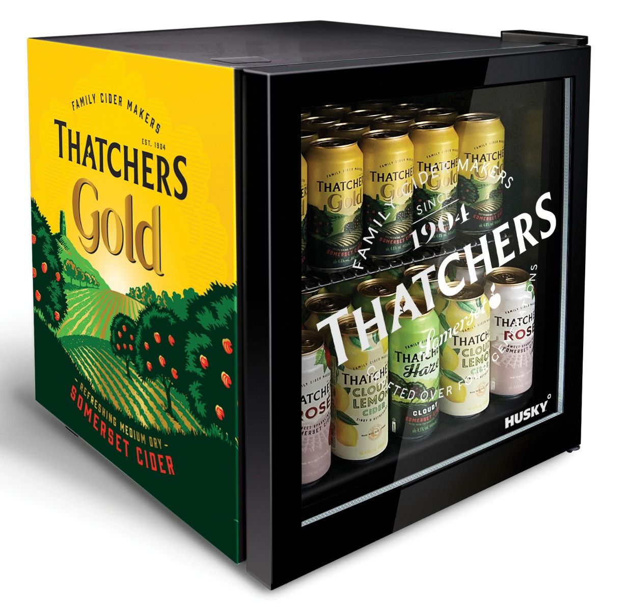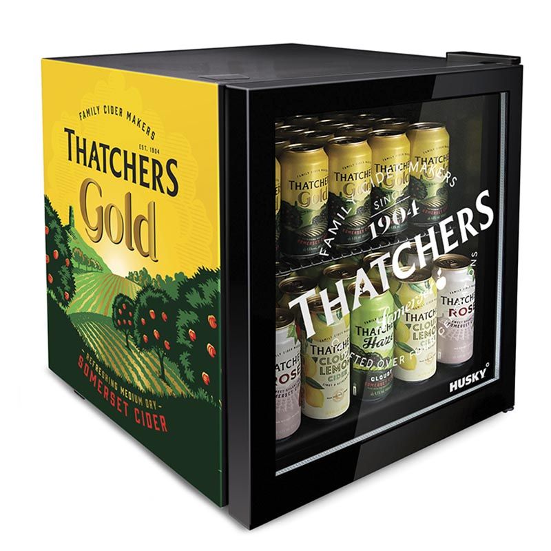 The contemporary black and yellow cabinet features side printed branding of the Thatchers Gold cider countryside, whilst the double glazed door showcases the Thatchers logo, providing tempting visibility to the contents inside.