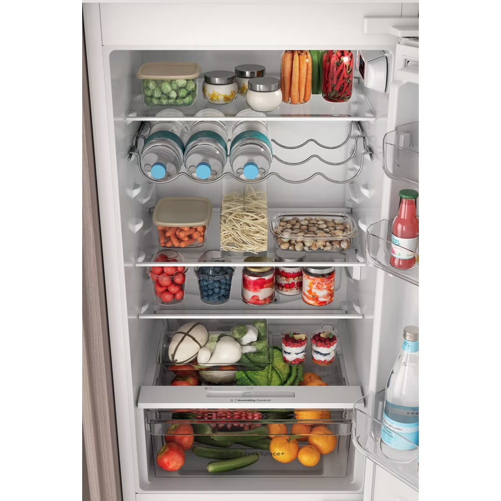 Make storing the weekly shop easier with this Indesit integrated 70/30 fridge freezer. Designed to fit seamlessly into your kitchen, it has a 273L capacity, which gives you plenty of room for up to 15 shopping bags of groceries, allowing for easy unloading after a big shop. Low Frost means less ice and more room inside your freezer. Easy-to-clean glass shelves make it simpler than ever to keep your freezer frost-free. The convenient Push&Go button activates extra cooling power for a faster temperature recovery in your fridge, keeping your food fresh. Inside the fridge, there's a dedicated Fresh Space that creates the right conditions to keep your fruit and vegetables fresh. You'll also find a useful wine rack, while energy-efficient LED lighting gives you maximum visibility of every shelf and corner. The Fast Freeze function means that when you return home from the shops, you can be sure your freezer will help to preserve the freshness of your food by freezing it in super speedy time. You can even customise your fridge freezer to suit your needs. Flexible door balconies create space for tall bottles, giving you extra room inside the fridge. Should the fridge door be left open, the handy fridge door alarm will alert you.