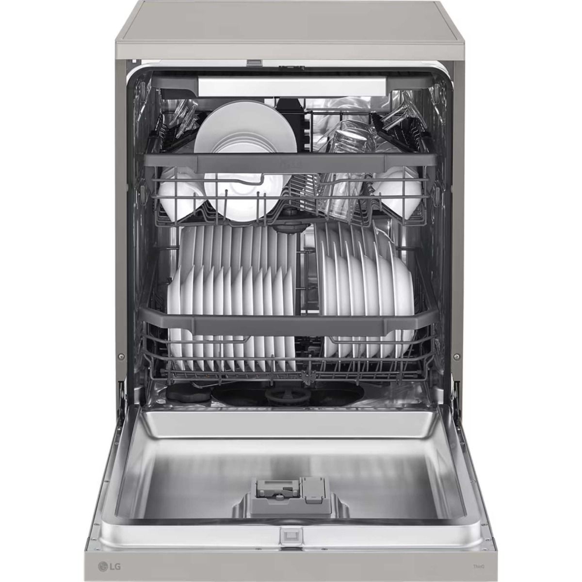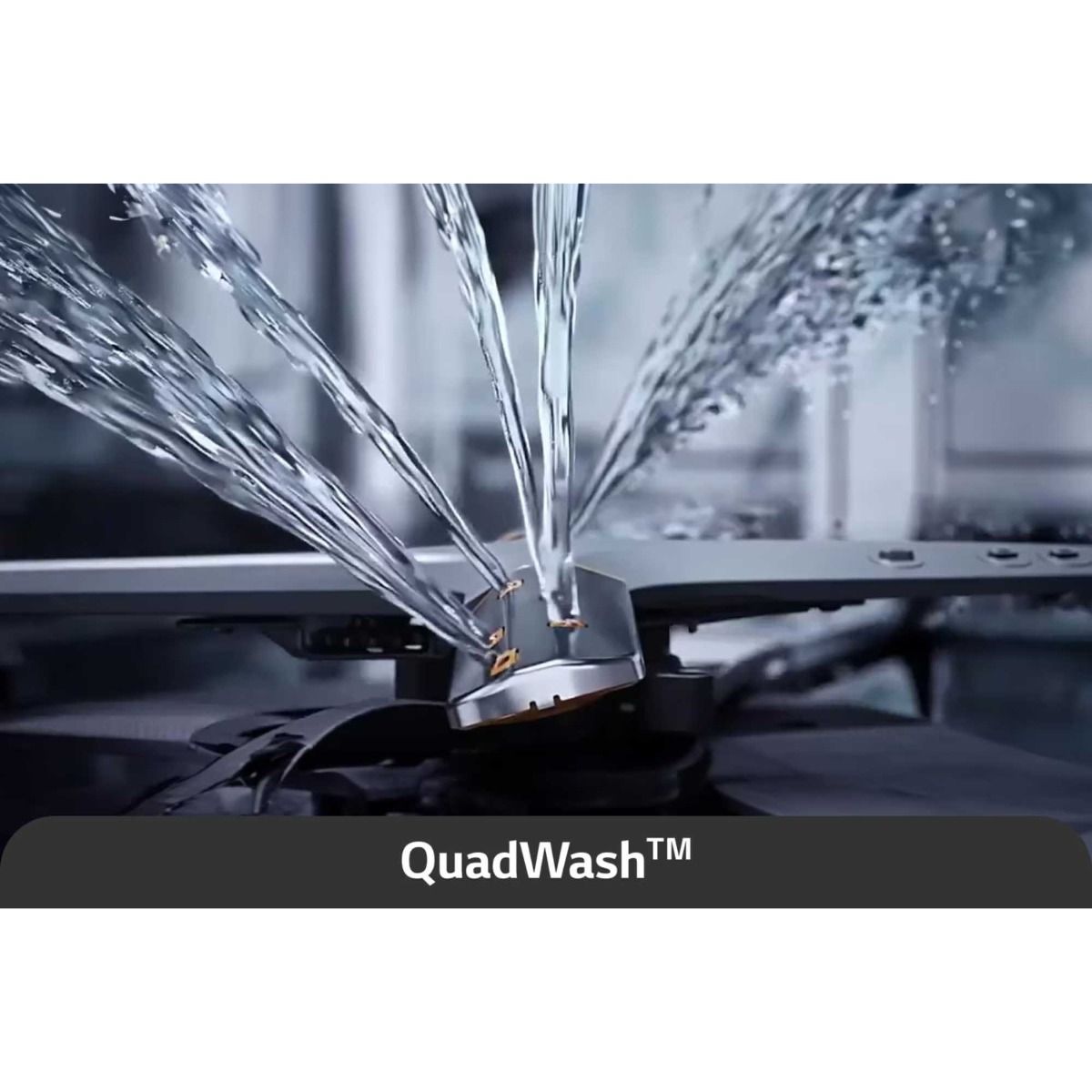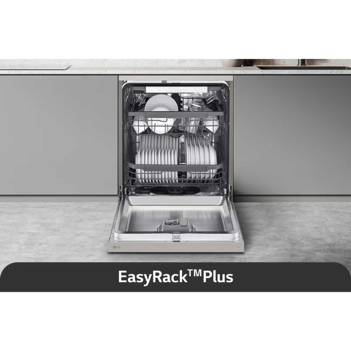 LG's QuadWash™ four arm system cleans with wider coverage using powerful streams of water. , LG's Auto Open Door opens the door at the end of the cycle to allow excess steam to escape , LG's EasyRack™ Plus offers loading with maximum flexibility, to fit and wash various items , LG's Direct Drive motor controls water circulation for quiet performance and durability. , Gently wash in the upper basket and intensely wash pots in the lower basket with Dual Zone , With LG ThinQ you can oversee the product status and even download new dish programmes