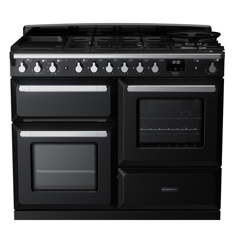 Upgrade your kitchen with the Rangemaster ESDLO110DFPGBL/CM1 15146 ESTEL DLX OC 110 DF Range Cooker. This sleek black and glass cooker features dual fuel capabilities, providing the ultimate cooking experience. Perfect for any modern home in the UK or Ireland.