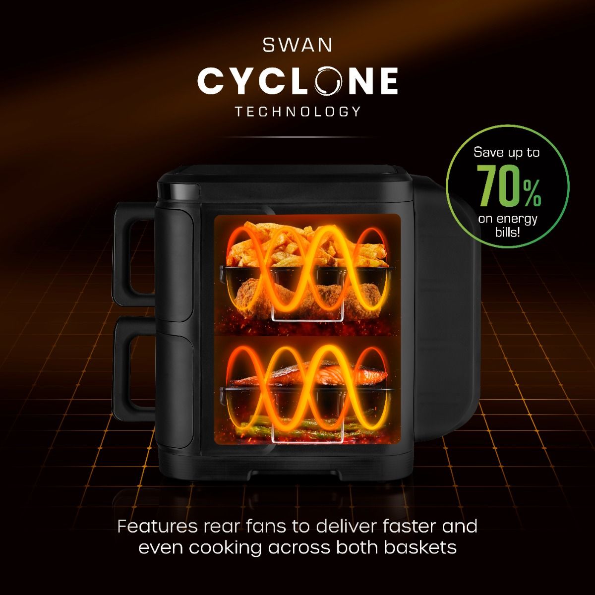 Looking to upgrade your single basket air fryer or thinking of a first time purchase but don't have the worktop space? The Swan Duo Layer Air Fryer has both baskets stacked on top of each other, saving 30% more worktop space. Its extra-large capacity of 11L comprises two 5.5 litre baskets, each big enough to cook a whole chicken and make enough portions for a family of 8. Comes with 10 pre-set meal selections, Dual Cook does both baskets at the same temperature and time, while Sync does two ingredients at different settings. All can be controlled on the intuitive touch colour digital display, which is fully foldable to save even more space. This digital air fryer saves up to 67% on energy costs compared to oven cooking. Create your fried favourites with 99% less oil for a healthier meal you and your loved ones will enjoy.