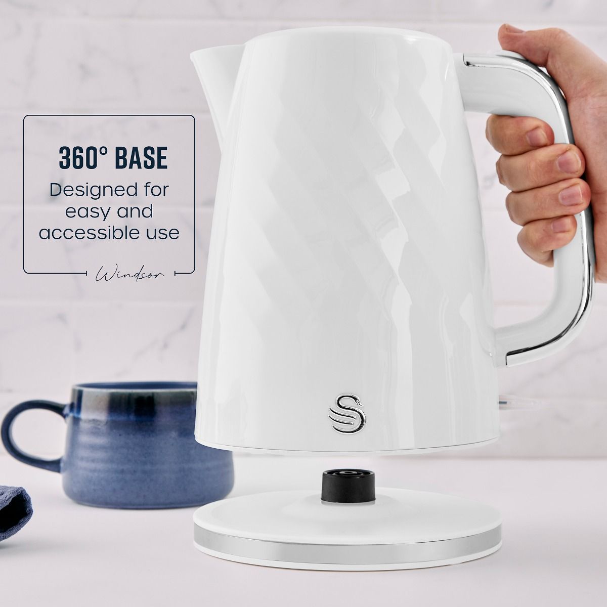 Start your day off the right way with a good brew. This Swan SK14611WHT Windsor cordless electric kettle features a textured gloss finish with chrome accents to add subtle contemporary flair to your kitchen. Featuring rapid boil technology, this white kettle boils one cup in under 45 seconds so youre ready to take on the day without delay. The large 1.7 litre capacity makes up to seven cups of tea, coffee, or hot chocolate from a single boil - perfect for busy households. The 360-degree base works for left and right handed users, while the lid pops up with a button press to make refilling quick and easy. The limescale filter collects all limescale to keep your water tasting fresh, which can be removed for cleaning. You can also monitor water levels through the window, so you know when its time to refill. To keep your kitchen worktop neat and tidy, the hidden cord storage leaves it free of cables. This cordless kettle has non-slip feet for added stability and boil dry protection for a more economic boil.
