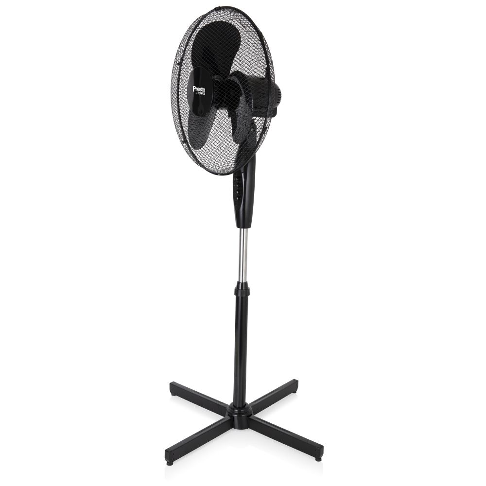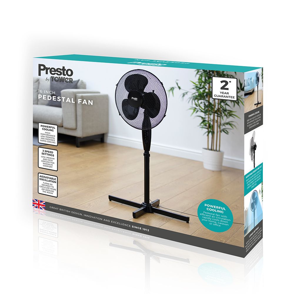 This 16 inch pedestal fan from presto is easy to assemble and the perfect addition to your home or office space. It features 3 variable speed settings - low/medium/high - which is just what you need to keep you comfortably cool in different climates. The 90 degree oscillation, adjustable height and tilt functions provide the flexibility needed to ensure the airflow is directed exactly where you need it to. This fan has been designed with convenience in mind thanks to the handy integrated carry handle, which makes for easy movement. Featuring a topple resistant base and anti-slip rubber feet; it helps avoid the risk of the pedestal fan falling over.