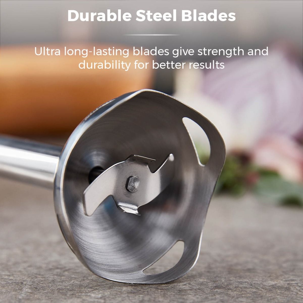 Perfect for a variety of food preparation needs, this Tower Cavaletto stick blender is a great addition to your kitchen collection. Featuring 600W of power, the blades blend through a range of ingredients, including fruit and vegetables, so you can make delicious healthy smoothies or soups. The ultra-long-lasting Durablade stainless steel blades are strong and robust, providing more efficient performance and durability. There are two different speed settings, which includes a turbo function, providing more control and efficient blending. This hand chopper features an ergonomic design with rose gold accents and a Softex coating that gives you added safety and support for comfortable performance. A one-touch button operation is easy to use, so you can quickly and efficiently prepare your food.
