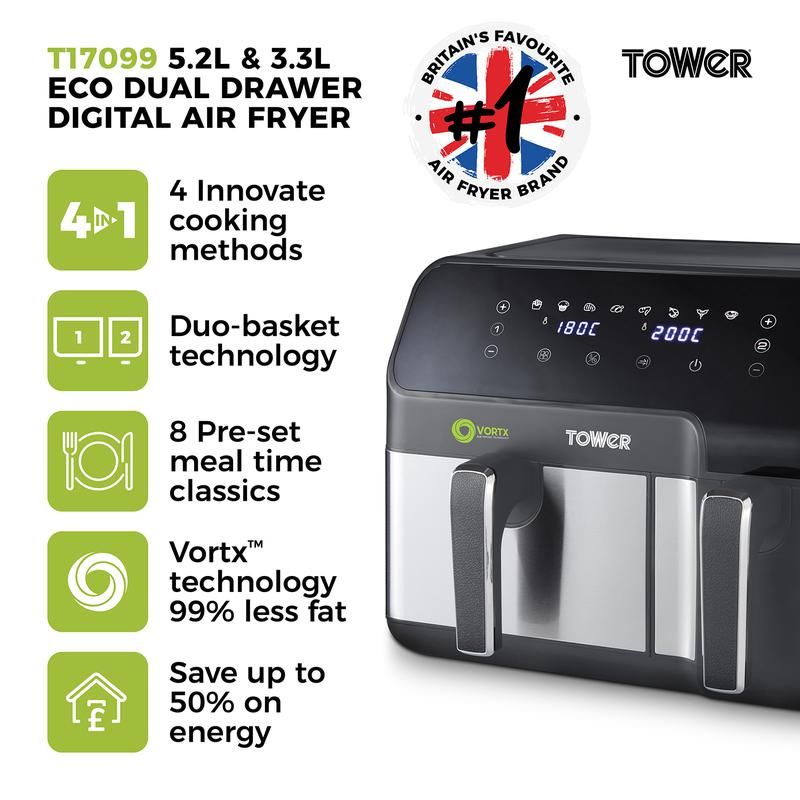 Tower T17099 Vortx 5.2L + 3.3L Eco Dual Drawer Air Fryer With 8 One-Touch Presets, 1700W Power, Black