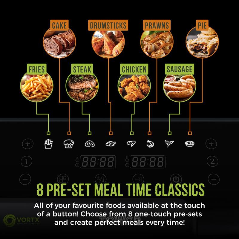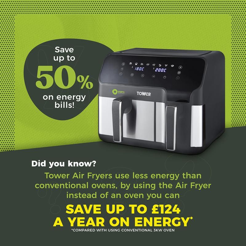 Exclusive to Tower Air Fryers, Vortx technology rapidly circulates hot air around food. Cooking up to 30% faster than a conventional oven and using 99% less oil, allowing you to save up to 50% on your energy. The Two Eco Dual Drawer Air Fryer boasts two different size baskets to provide the ultimate in air frying versatility. Giving you the freedom to cook single portions or larger portions, as required.You can cook separate meals simultaneously in the 3.3L and 5.2L drawers with a combined capacity of 8.5L, enough to feed 8 people at once. The Smart Finish control will adjust cook times automatically, so that both baskets finish cooking at the same time. You can also choose from 8 one-touch pre-sets to take the guess work out of cooking.