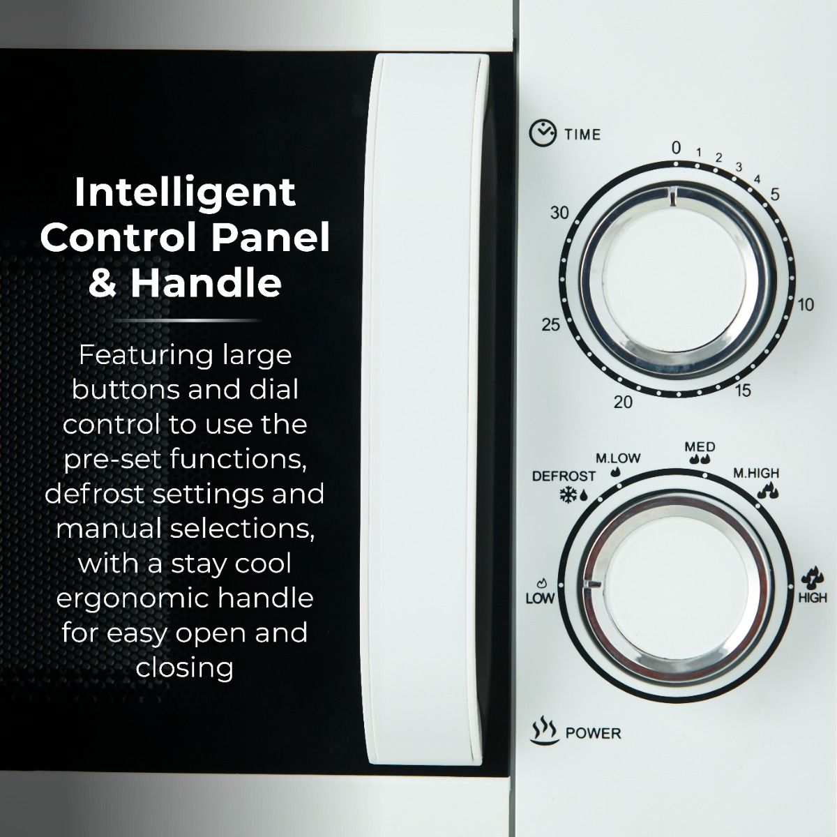 Powered by MagnaWave technology, concentrated waves circulate to ensure heat is distributed evenly for a well cooked meal - keeping intense flavours for amazing results. This microwave features a powerful 800W output for faster cooking heating, with 6 adjustable heat settings. The huge inner 20 litre capacity can easily fit a standard 10 dinner plate, giving you versatility to use large dishes to cook for the whole family. Its 30-minute timer provides enough time to cook meals with complete precision, whilst the defrost function cooks meals from frozen in minutes - ideal for leftovers or a speedy emergency snack. The intelligent control panel features large buttons dial control to use the pre-set functions, defrost settings manual selections, with a stay cool ergonomic handle for easy open closing. A high quality glass turntable ensures your food is cooked thoroughly, while its sleek mirror door looks great in modern kitchens. The easy clean interior requires a simple wipe after use.