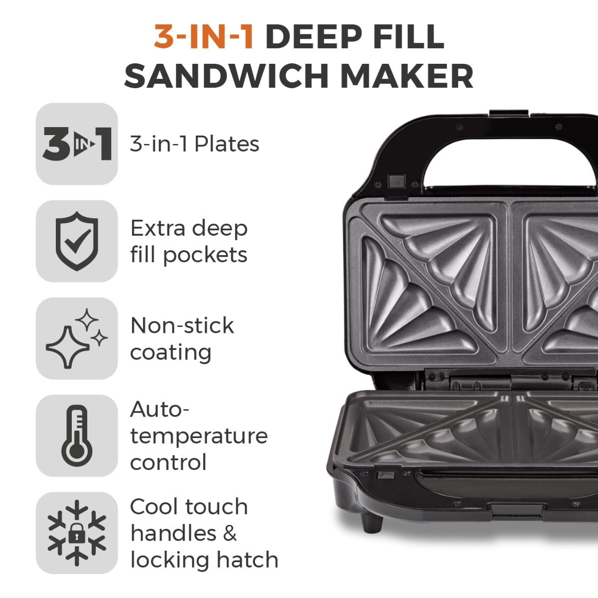 Tower T27032 3-In-1 Deep Filled Snack Maker With Non-Stick Coated Plate And Automatic Temperature Co