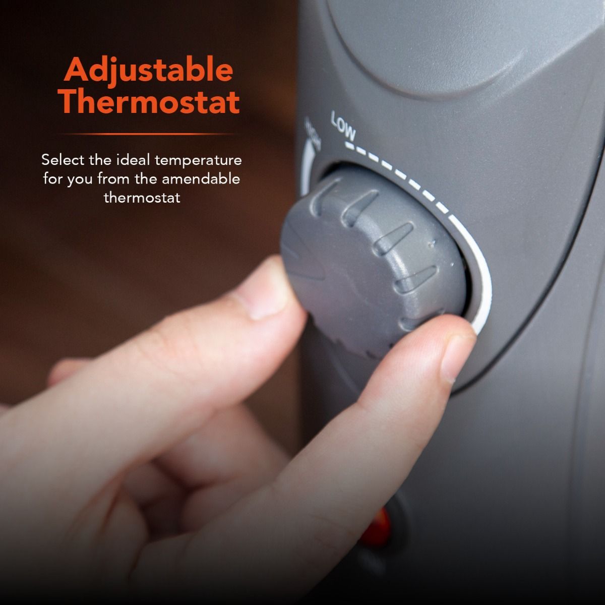 Make your home cosy with warmth using Warmlite's efficient and stylish oil filled radiator. With 5 heated fins and 650W of power, this easy-to-use small radiator has a mighty performance to rapidly heat up rooms of your choosing ready for winter days. The adjustable thermostat with a maximum temperature of 105C makes finding the perfect temperature simply creating a comfortable setting in your home or office. Never forget to turn the radiator off, as when the unit is in operation, it will notify you with the LED power indicator light. Featuring safety functions, it comes with built-in overheat protection, preventing the oil from becoming too hot making it safe to use around pets and children. The tip-over switch automatically shuts the unit off if accidentally knocked over. An integrated handle allows you to move the portable and lightweight radiator to whichever room you need it.