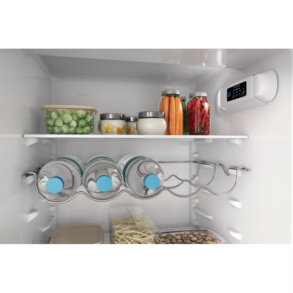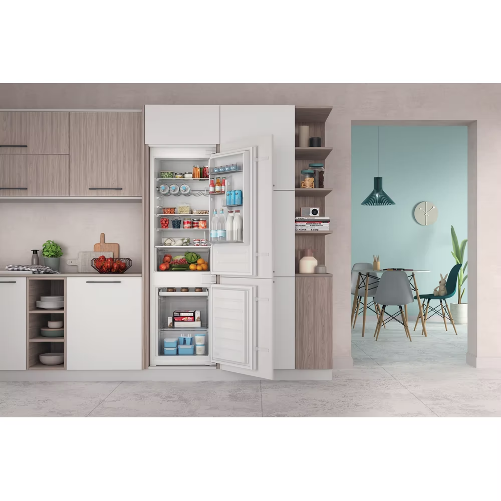 Make storing the weekly shop easier with this Indesit integrated 70/30 fridge freezer. Designed to fit seamlessly into your kitchen, it has a 273L capacity, which gives you plenty of room for up to 15 shopping bags of groceries, allowing for easy unloading after a big shop. Low Frost means less ice and more room inside your freezer. Easy-to-clean glass shelves make it simpler than ever to keep your freezer frost-free. The convenient Push&Go button activates extra cooling power for a faster temperature recovery in your fridge, keeping your food fresh. Inside the fridge, there's a dedicated Fresh Space that creates the right conditions to keep your fruit and vegetables fresh. You'll also find a useful wine rack, while energy-efficient LED lighting gives you maximum visibility of every shelf and corner. The Fast Freeze function means that when you return home from the shops, you can be sure your freezer will help to preserve the freshness of your food by freezing it in super speedy time. You can even customise your fridge freezer to suit your needs. Flexible door balconies create space for tall bottles, giving you extra room inside the fridge. Should the fridge door be left open, the handy fridge door alarm will alert you.