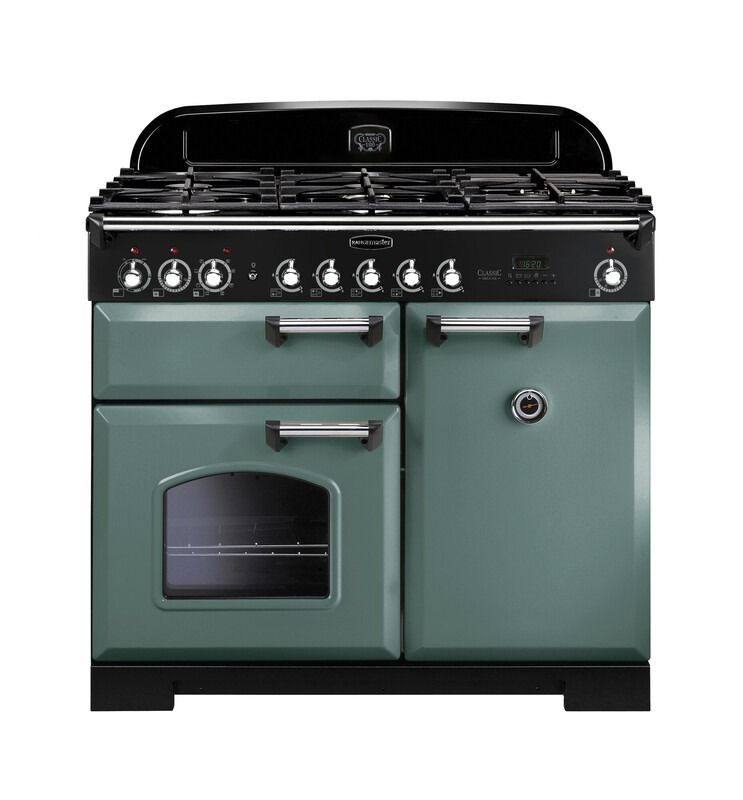 Product Name : | Rangemaster CDL100DFFMG/C Classic Deluxe 100cm Dual Fuel Range Cooker in Mineral Green and Chrome A Rated |