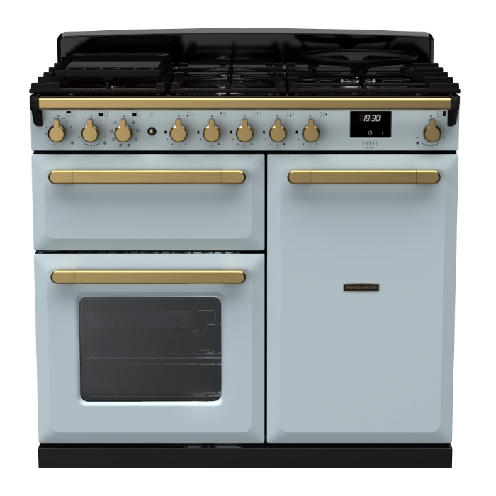 | Product Name : | Rangemaster ESDL100DFPMSB/AB1 100cm Wide Dual Fuel Range Cooker - Misty Blue / Antique Brass - A Rated |