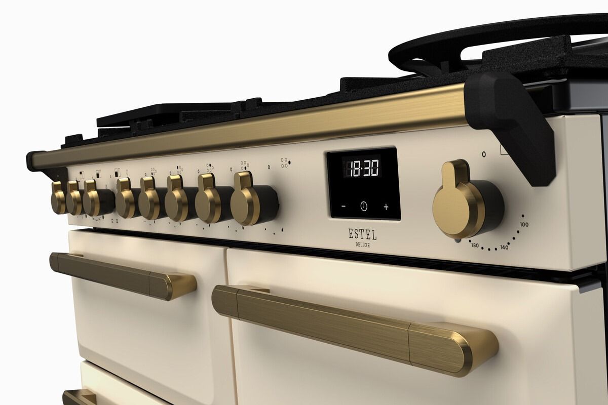 Elevate your kitchen with the Rangemaster ESDL100DFPPCR/AB1 18076 100cm Wide Dual Fuel Range Cooker in a stunning Pale Cream and Antique Brass finish. This stylish and versatile appliance offers precise cooking control and ample space for all your culinary creations. Experience the perfect blend of modern design and traditional charm with this premium range cooker.